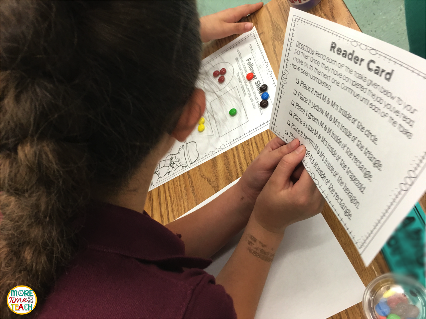 The Reader’s job was to read a series of tasks to their partner. The Follower had to listen carefully and follow the directions such as “place 3 red M&M’s inside of the circle”… Some of the groups had to reread the last task carefully because they incorrectly assumed that the last M&M belonged in the empty shape (Which it did NOT!) This was a great opportunity to remind the kids NOT to assume, but to read directions carefully!